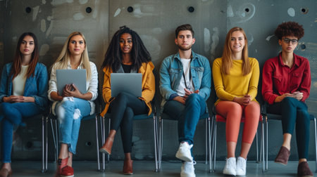 Group of young people sitting in a row and looking at each other