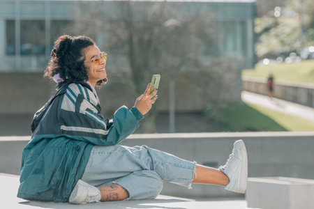 girl on the street sitting with mobile phone or smartphone