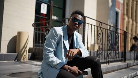 Portrait of young attractive stylish african american man model posing in casual clothes against neutral background looking sexy with afro hair. In People Youth Beauty and fashion concept.