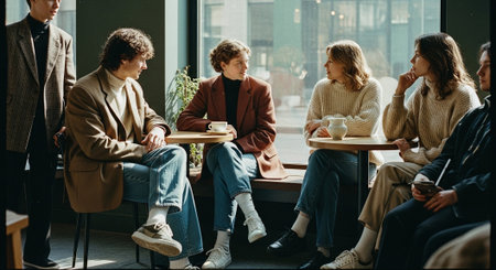 A group of young adults sitting in a cozy cafe, engaged in conversation, with warm lighting and modern decor