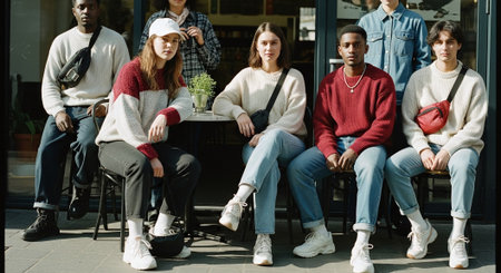 A group of young adults sitting at a cafe, wearing casual sweaters and jeans, with a plant on the table, showcasing a relaxed atmosphere