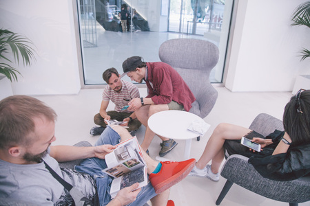 Happy diverse young multiethnic men and women sharing social media news using mobile gadgets, selective focus. Group of positive business people talking sitting in chairs in office lobby by window.