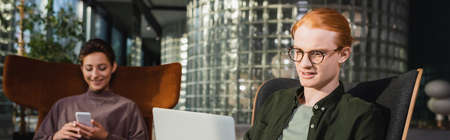 Young man looking at laptop near blurred girlfriend with smartphone in hotel lobby, banner