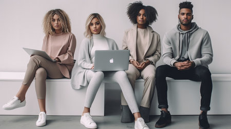 Friendy mixed race team of business workers work with modern technologies wear fashionable clothes use high speed connection isolated over grey concrete wall Internationa : Generative AI