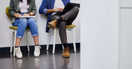 Were all trying to find our place in life. Shot of two unrecognizable people using their devices while waiting to be interviewed in a modern office.