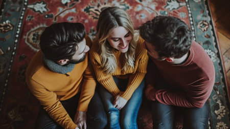 Three people sitting on a rug looking at each other, AI