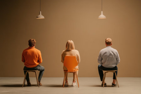 Three individuals sit on chairs against a minimalist background, showcasing themes of contemplation and solitude.