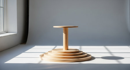 (576) showing wooden tiered display stand with circular platforms and central column in bright studio lighting. resolution