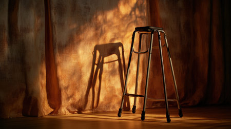 A solitary metal stool casts a striking shadow against a softly lit fabric backdrop, creating a warm, serene atmosphere ideal for artistic representation.