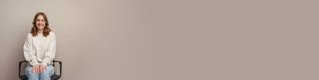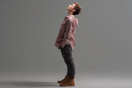 Full body profile of a cheerful person standing with a relaxed pose in a studio environment during a professional photoshoot