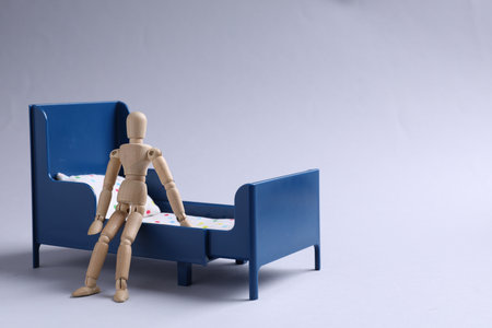 Wooden mannequin with toy bed on light background, closeup. Space for text