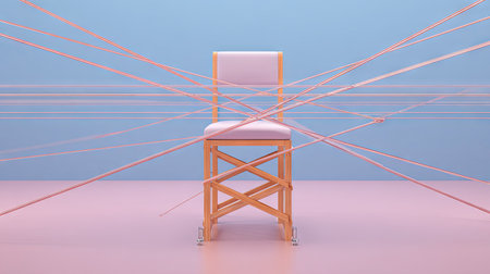 This image features a minimalist wooden chair surrounded by colorful elastic bands against a pastel background, creating a vibrant and artistic scene.