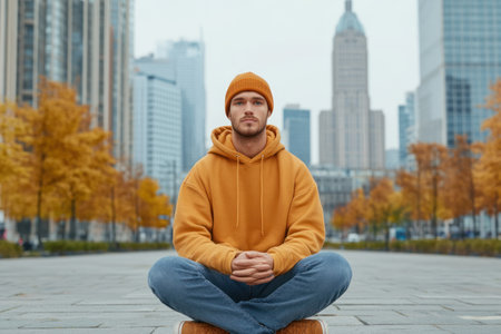 Solitude in the Urban Landscape: A Contemplative Man Sitting on a Concrete Bench