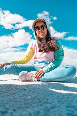Trendy fashionable woman relaxing outdoor wearing casual footwear white sneakers and hole trousers. Female enjoy sunlight against blue sky.
