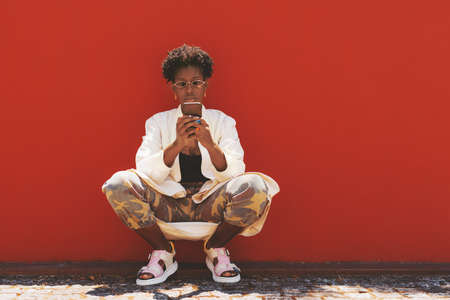 A dazzling fancy young African female is squatting in front of a red wall and using her smartphone; an elegant black woman in sunglasses, camouflage pants, and nail art is phoning near a red surface
