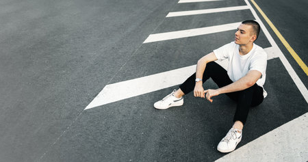 Candid portrait of a trendy handsome young man in city. Caucasian in early 20s man sits on the parking lot ground in urban setup. Looking away. Casually dressed. Lifestyle Millenials. Short hair
