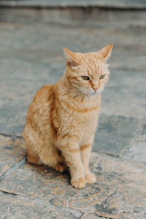 Portrait of a cute red cat on a street of old town. Portrait of a street cat.