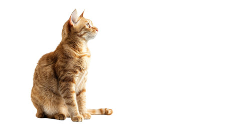 Cute ginger cat sitting and looking curiously on white background. Space for your text. Adorable home pet stock photography