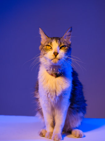 A captivating portrait of a long-haired cat, illuminated by vibrant neon blue and orange light against a deep purple backdrop.