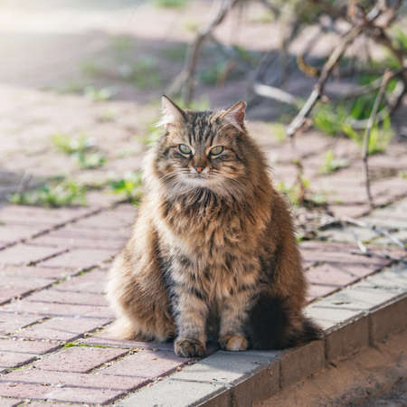 Portrait of cute cat with focus on eyes of gray orange and black colors posing and looks at the camera on the ground on the evening time. Pet outdoor close up concept with copy space