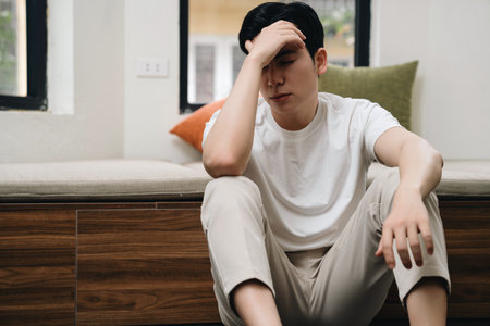 Sad depressed anxiety Asian man thinking contemplating bad thing happened in his life, stress exhausted feeling down expression, financial or relationship problem concept