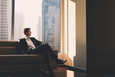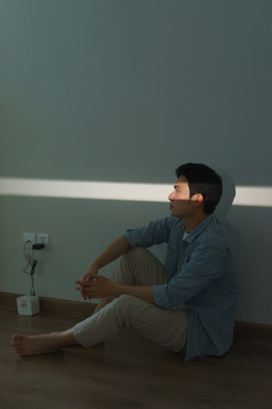 A young man is seated on the floor, leaning against a wall in a minimalistic indoor space. Soft morning light streams in, casting a gentle glow as he appears lost in thought.
