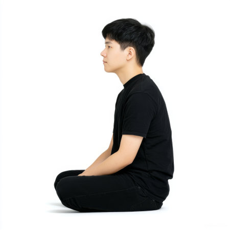 A young Asian male sits in a side profile view on a clean white background, dressed in a black outfit, exuding calm and thoughtful energy.