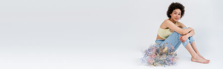 African american model in top and pants sitting near dry flowers on grey background, banner