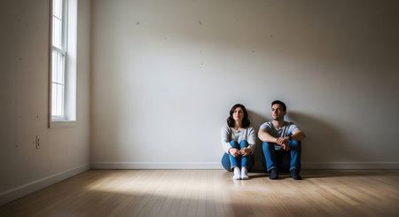A thoughtful young couple sitting on the wooden floor of an empty room with white walls. They look contemplative, perhaps discussing their future in a new home or facing a relocation challenge.