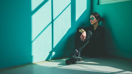 A pensive woman sitting on the floor against a wall in a sunlit room, hugging her knees with a somber expression. The stark geometric shadows cast by the window emphasize themes of loneliness, depression, or deep contemplation.