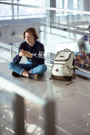 waiting for a flight at the airport. girl with a phone and a backpack sits on the floor
