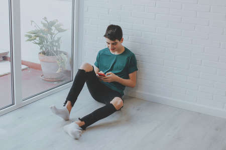 young or teen at home with mobile phone