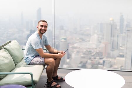 Young man using a smartphone on a bar terrace overlooking the skyscrapers