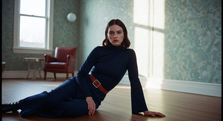 Portrait of a cute girl teenager posing on the floor in the room. Beauty, fashion.