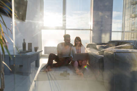 Young Couple Sitting On Floor Using Laptop Tablet Computer Modern Apartment Big Panoramic Window Sea View, Mix Race Man Woman Morning Home Interior