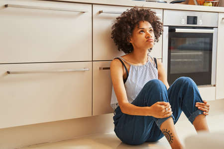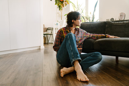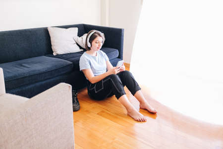 Young woman sitting on the floor in the living room at home.