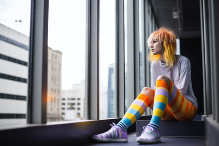 young beautiful red hair hipster woman at the window in the city