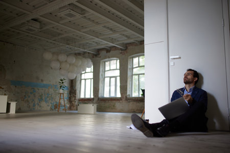 Portrait of young businessman sitting on floor in empty room. Business closure. Depression and crisis. Concept of business, challenges, work, occupation. Going out of business