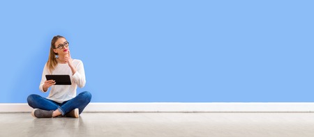 Young woman holding a tablet computer in a thoughtful pose