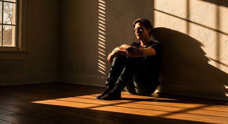 A young man sits alone on the floor in the corner of a room, illuminated by dramatic strips of sunlight through blinds. His expression and posture convey feelings of sadness, depression, isolation, or deep thought.