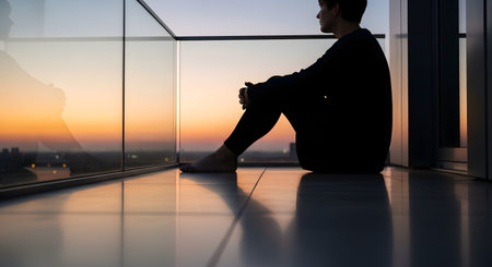 A silhouette of a person sitting on the floor of a modern balcony, gazing out at the colorful sunset and city skyline. The image evokes feelings of solitude, deep thought, and the peaceful end to a day in an urban setting.