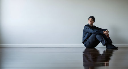 A young man sits alone on the wooden floor of a large, empty room, looking away with a pensive expression. The minimalist setting and his body language suggest feelings of solitude, deep thought, or waiting.