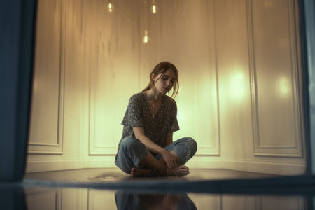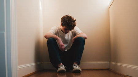 Sad teenager crouching in corner of a room suffering from stress, anxiety, depression and loneliness, feeling hopeless and devastated during a time of crisis and emotional vulnerability