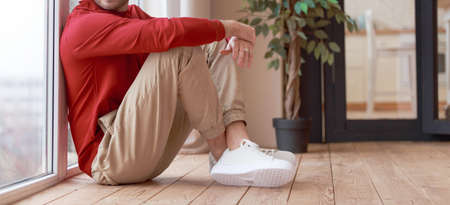 Melancholy concept. Man in burgundy blank sweatshirt or long sleeved. Sitting on floor near window at home. Mockup for print