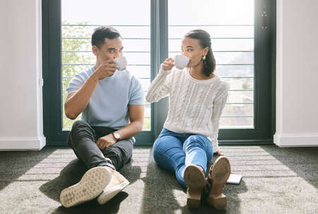 Our first cup of tea in our new home. Full length of a young couple sitting together in their new home and enjoying a cup of tea.