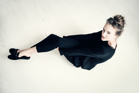 Beautiful young model wearing black, casual clothes, sitting on the wooden floor found on a white wall. Studio portrait.