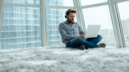 A young man sits on a plush white carpet in a modern office, immersed in his laptop while enjoying the tranquil city view through large windows.