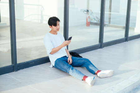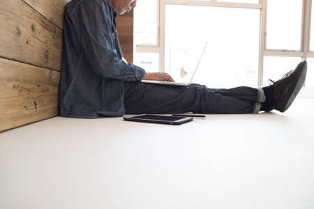 Happy creative freelance Asian man sitting on the floor smile and looking out.