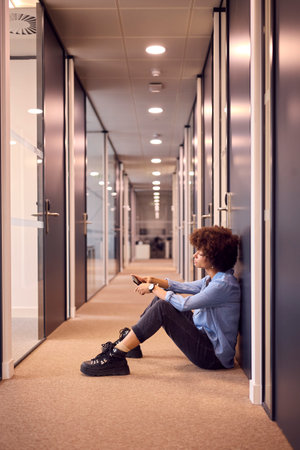 Stressed Young Businesswoman Sitting On Floor In Corridor Of Modern Office With Phone