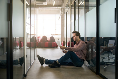 Serious corporate worker dealing with business documents in office corridor